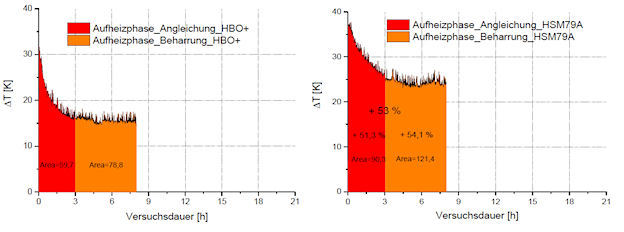 Anheizphase (20°C) deutlich höher als bei Schamott, dann stagniert sie