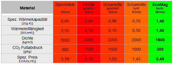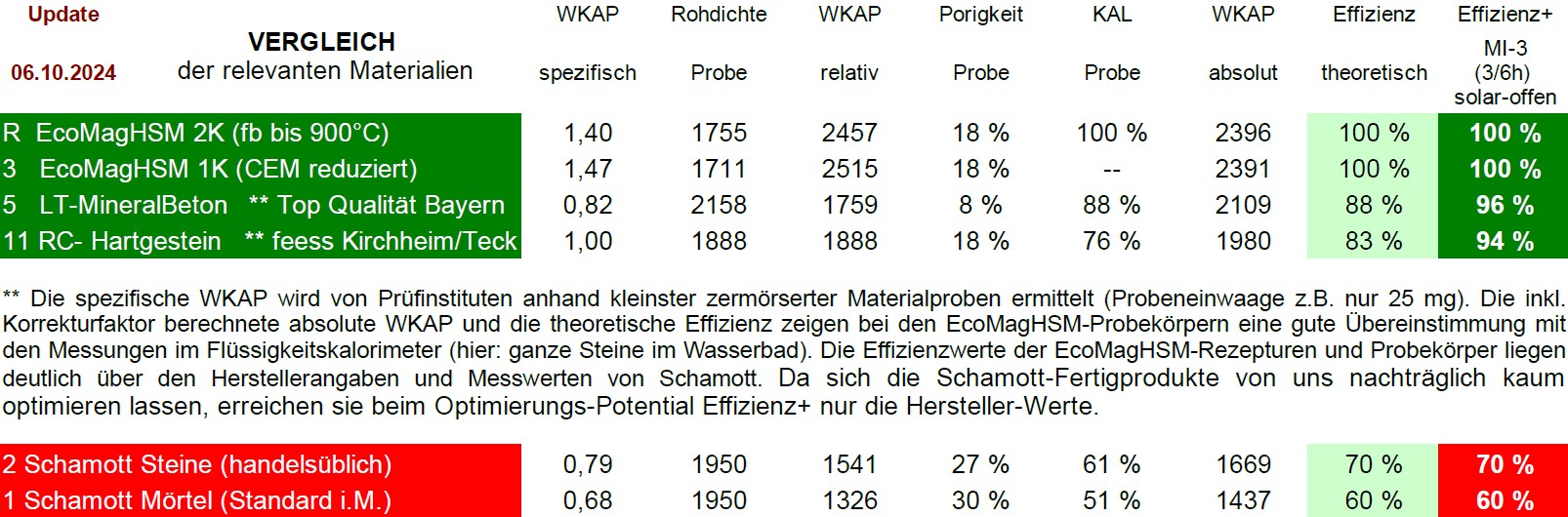 Der Vergleich mit anderen Materialien der Wettbewerber zeigt, dass EcoMagHSM nicht nur überlegene physikalische Eigenschaften besitzt, sondern auch viel günstiger ist. Eine höhere spezifische Wärmekapazität ist besser UND sollte mit einer höheren Wärmeleitfähigkeit übereinstimmen, da andernfalls die Effizienz des Wärmespeichers aufgrund der schnellen Wärmeableitung des Materials nur gering ist. In dem deutlich niedrigeren spezifischen Preis summieren sich alle Vorteile von EcoMagHSM. Zusammen mit dem CO2-Fußabdruck hat EcoMagHSM immer die besseren Werte (Fraunhofer Gesellschaft IBP Zusammenfassung des ZIM-Projekts "MagnesiaHSM").