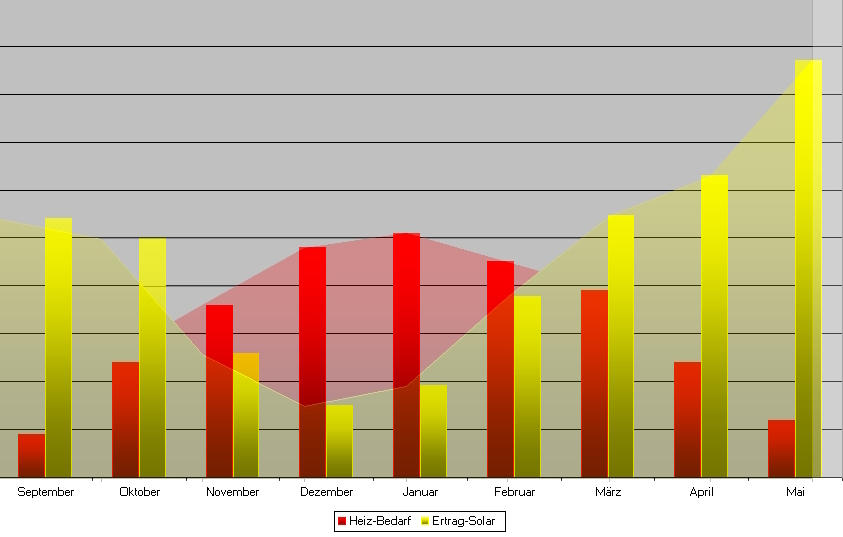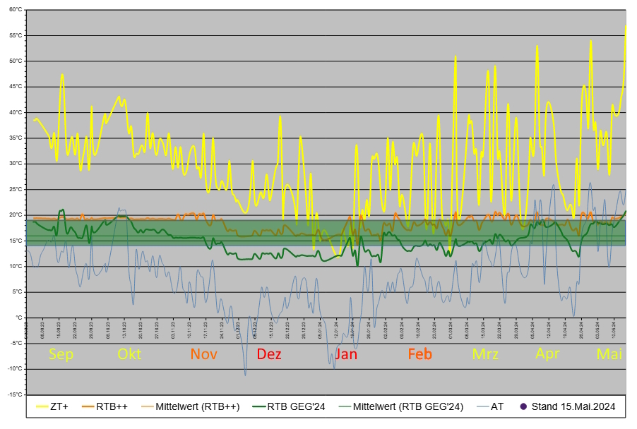 ▲ grüner Bereich: 65% von 23°C Raumtemperatur = ca. 15°C (durch DIY-Speicher auch in der Nacht).