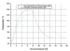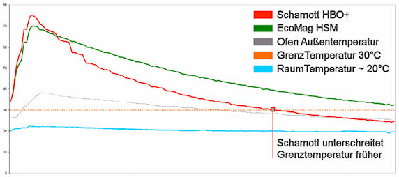 identischer Masse übertrifft der EcoMagHSM den deutlich schwereren Schamott Stein bei der Wärmespeicherung wieder um ca.